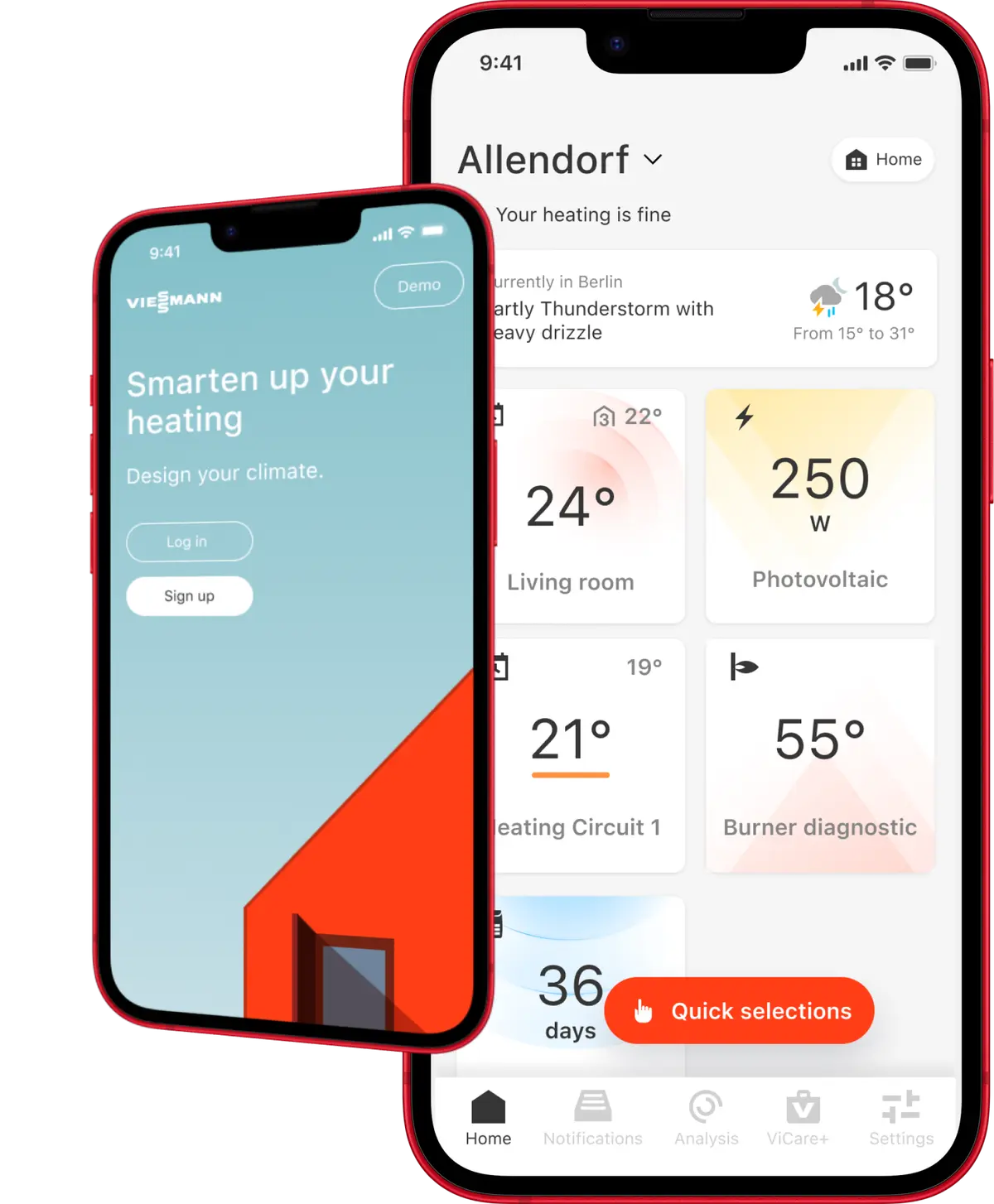 ViCare is a large app, consisting of 250 in app screens allowing you to control a number of Viessmann devices. The app itself communicates with our state of the art back end, what allows us to develop features and functionalities on a regular basis, while code refactoring ensures compatibility with all current standards and practices.